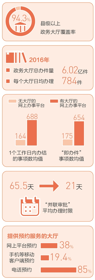 成为权责清单制度、“多证合一”等改革措施施行的主要平台。全国政务大厅入驻行政许可事项51.4万项,平均每个政务大厅可办理168项。推行“多证合一”的过程中,企业登记平均办理时限由之前的16.8天缩短至3.4天,压缩幅度达79.8%。此外,17.9万个事项实现即办即结,立等可取;924个政务大厅开展证照寄送服务,有效减少群众跑腿次数。