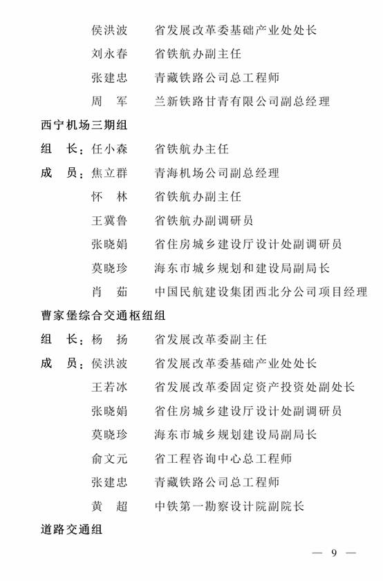 由省委常委、常务副省长王予波任指挥长,副省长韩建华任第一副指挥长,省发展改革委主要负责同志任常务副指挥长,西宁市、海东市、黄南州主要负责同志及省政府分管副秘书长、省发展改革委分管副主任任副指挥长,省监察厅、省财政厅、省国土资源厅、省环境保护厅、省住房城乡建设厅、省交通运输厅、省水利厅、省林业厅、省商务厅、省审计厅、省旅游发展委、省金融办、省铁航办主要负责同志,西宁市、海东市、黄南州分管负责同志,民航青海监管局、国网青海省电力公司、青藏铁路公司、青海机场公司、兰新铁路甘青有限公司、中铁第一勘察设计院、中国民航建设集团西北分公司等部门、单位主要负责同志为成员。(名单详见附件1)指挥部下设综合协调组(融资工作组)、西成铁路组、西宁机场三期组、曹家堡综合交通枢纽组、道路交通组。(名单详见附件2)