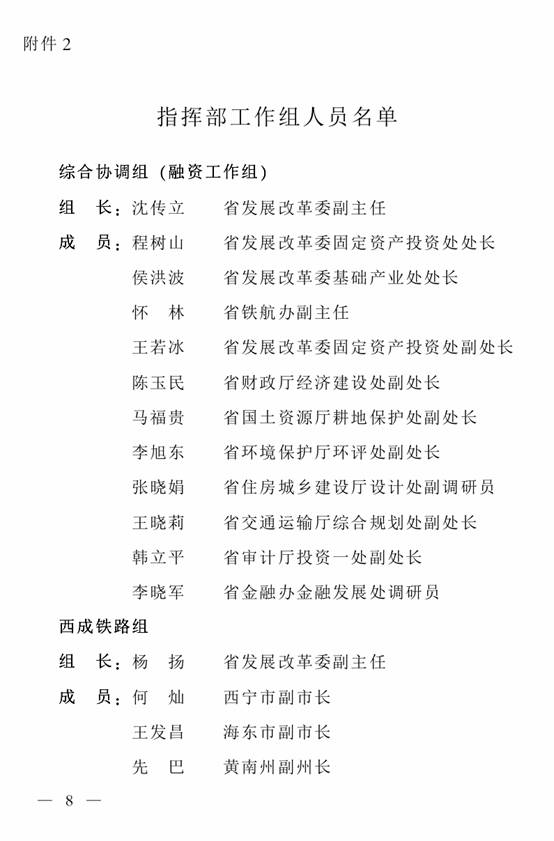 为积极推进西成铁路、西宁机场三期、曹家堡综合交通枢纽工程等省级重大项目建设,省政府决定成立西成铁路等省级重大项目建设协调指挥部(以下简称“指挥部”),现将有关事项通知如下: