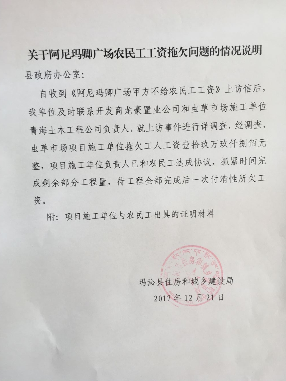 今年我们一批外来工在阿尼玛卿广场做外墙保温,到现在甲方都不给我们工资,其中包括龙豪公司,虫草市场,两个标段,听说这个工地都是政府行为。可到现在天气冷了,我们也基本做完了,甲方就是不给我们工资。我们也去劳动局了,他们说也没办法,我们现在一群人呆在这里,每天吃几个饼子,没生活费。我们在这无依无靠不知道怎么办?希望你们政府出面给我们解决一下。特别是虫草市场标段拖欠工资最多。求求你们政府能帮帮我们。谢谢。我把甲方的电话给你,龙豪公司:王总18297212892,虫草市场冶总:15597140999,我们农民工方李总:15597393999,谢谢你们能给我们主持公道!!! |