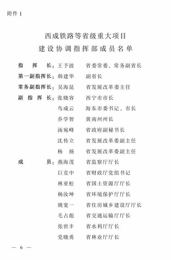 为积极推进西成铁路、西宁机场三期、曹家堡综合交通枢纽工程等省级重大项目建设,省政府决定成立西成铁路等省级重大项目建设协调指挥部(以下简称“指挥部”),现将有关事项通知如下: